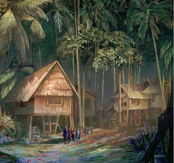 The town proper is ringed by the three stone formations at the perimeter. A crudely built stone wall runs from formation to formation, but over time has fallen into disrepair, inevitably resolving to become covered in vines and vegetation from the creeping forest. Various fishermen and ne’er-do-wells maintain scattered hovels and bungalows beyond this wall. Even so, safety cannot be guaranteed, whether due to the xenophobic nature of said rogues or other more ambiguous predators. It is said that the jungle conceals both good and bad deeds alike, and one “kind” man suggested we make the most of our now hidden venture and visit a local gambling den.